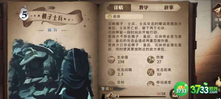 1、卡牌效果:召唤棋子·士兵。士兵攻击时嘲讽周围敌方单位,士兵死亡后会在原地留下两个石块。石块停留一段时间后开始行动。