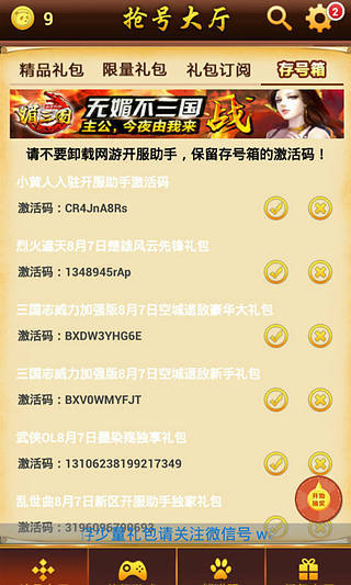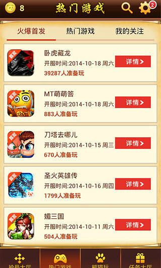 网游开服助手是一款专业的手机游戏辅助软件,帮助玩家建立网页游戏开服时间、最新手机网游搜索、网页游戏、互通游戏最新排行搜索、抢号大厅可以领取*游戏大礼包。游戏关注闹钟等时间定时队列。游戏队列时间到后手机左上角会出现游戏闹钟提醒图标并配有类似手机短信的声音和震动提醒。网页游戏开服表-*快捷的操作方式,新开网页游戏开服表游戏大全领衔掌握,让你玩转游戏,成为游戏达人。成为*顶尖的游戏达人。