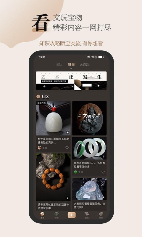 点评:欢迎使用古物潮玩APP!古物潮玩是涵盖珠宝玉翠、文玩杂项、工艺作品等领域的玩主互动交流社区,更为广大玩主提供专业免费的珠宝文玩在线鉴定服务,文玩大师教您盘玩秘诀。 【互动社区】 海量宝物信息等你来看,众多宝友、玩主和你交流。
