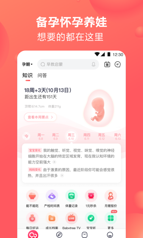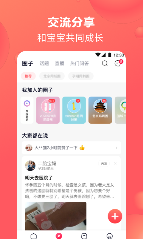 在这里,您可以和万千妈妈分享孕育经验,还能找到同城和同龄的小伙伴,闲暇时聊聊手工、美食、美容保养,令孕育生活更加丰富多彩!