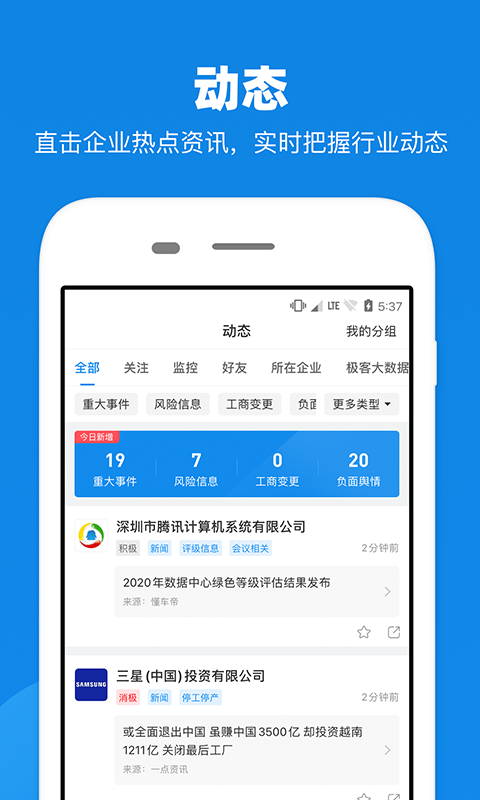 基本信息:工商信息、投资关系、法人信息、历史变更、股权结构、企业年报、企业评分、企业图谱、投资族谱等;