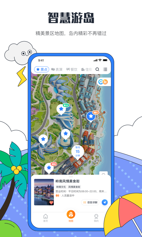 地图导览:精美手绘地图,全新升级您的智慧游园体验;