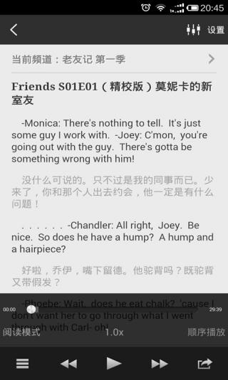 安卓系统上*好用的离线听力软件拥有每天更新的海量听力库,并*提供智能语音高亮跟随功。 -VOA标准、VOA慢速、BBC新闻每天更新-收入海量新概念、GRE、TOEFL听力资源 -收入海量日常会话训练、名人演讲资源 -*支持语音高亮跟随功能 -独创LightPeek划词搜索功能,对文章中的单词即指即译 -支持批量下载,离线使用,教室里、地铁里随时使用 -起床闹钟功能,每天起床为您播放当天最新的英语听力