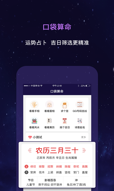 【口袋算命】手相、面相、求签、风水、黄历、吉日、诗意起名、qq号码测吉凶、福利数字测试吉凶、小测试;拥有专业的心理测试题,包括感情、生活、工作、财富、社交、人生、性格7种测试题。