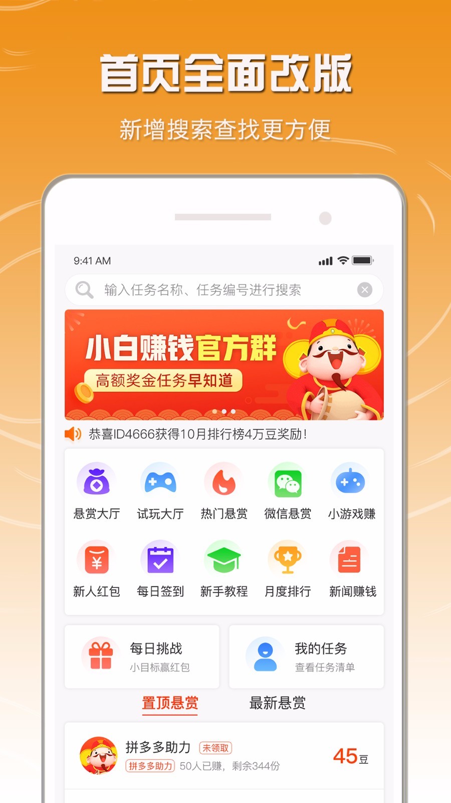 点评:用户可以通过小白赚钱APP,实现线上有偿互助。当有人有需要被人帮忙砍一刀或者助力火车票的时候,通过小白,他可以悬赏几毛钱就能找人帮忙完成任务,而不用去打扰自己的朋友圈或者社群。而对于另外一些人,宅在家里无聊或者想赚点零花钱。