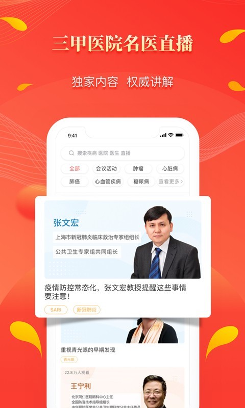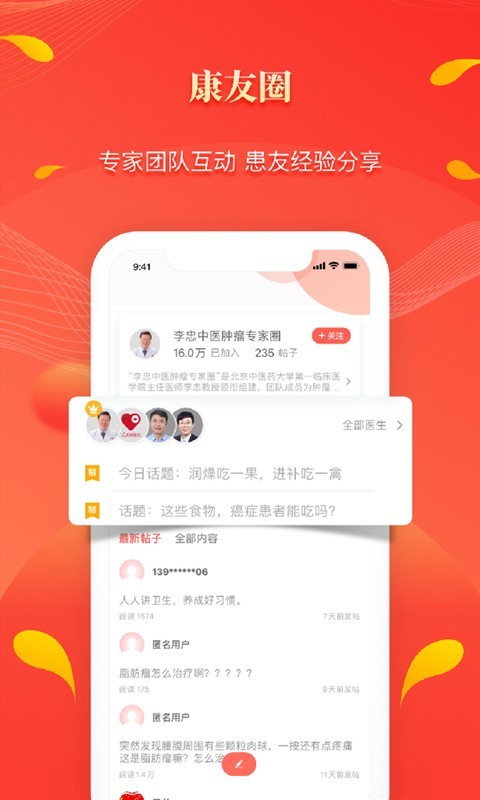 医生问诊:全国三甲医院副主任医师以上的医生在线接受问诊咨询。每周推出数位知名医生,与网友就热门疾病或健康话题进行在线交流,可视频、图文交流。