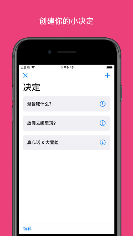 点评:小决定,一般又称小决定转盘中文版。生活中会经常遇到犹豫不决的事情,那么我们不妨可以通过小决定APP来帮助你做个决定吧,只需要输入你纠结的问题,添加或者导入所有的选项,用转盘来快速决定。