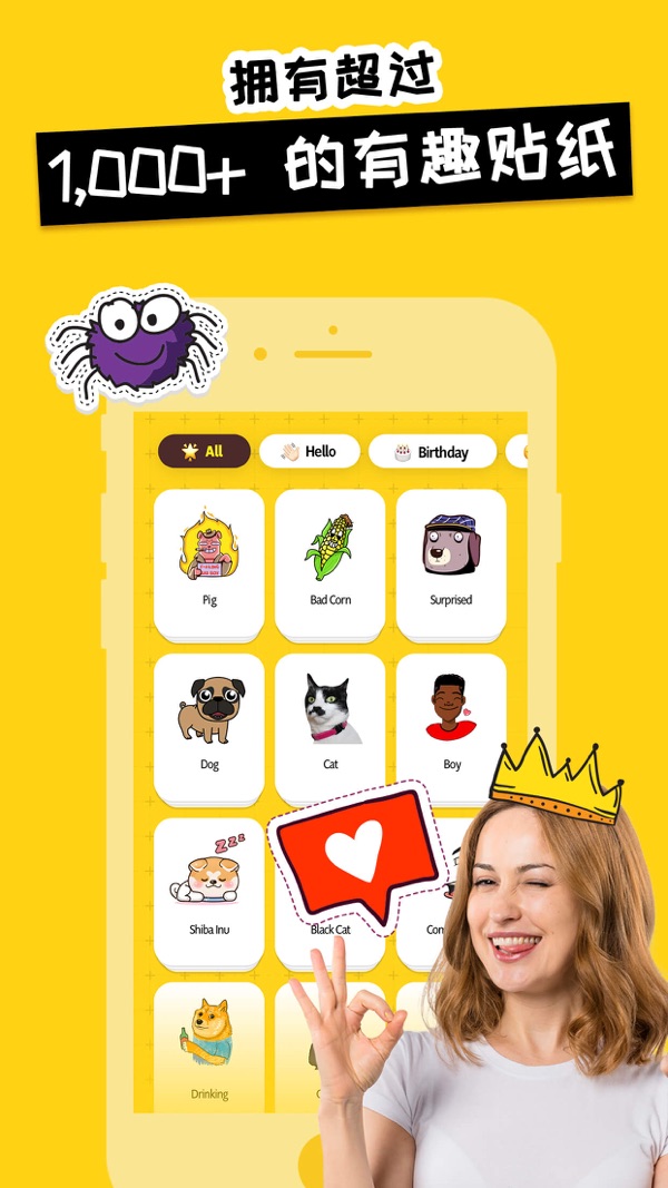 - 贴纸类别:漫画,表情包,可爱,动物等。
