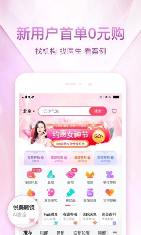 新人壕礼:新人注册悦美整形APP即送2000元新人礼包,更有1元秒杀天天限时抢。