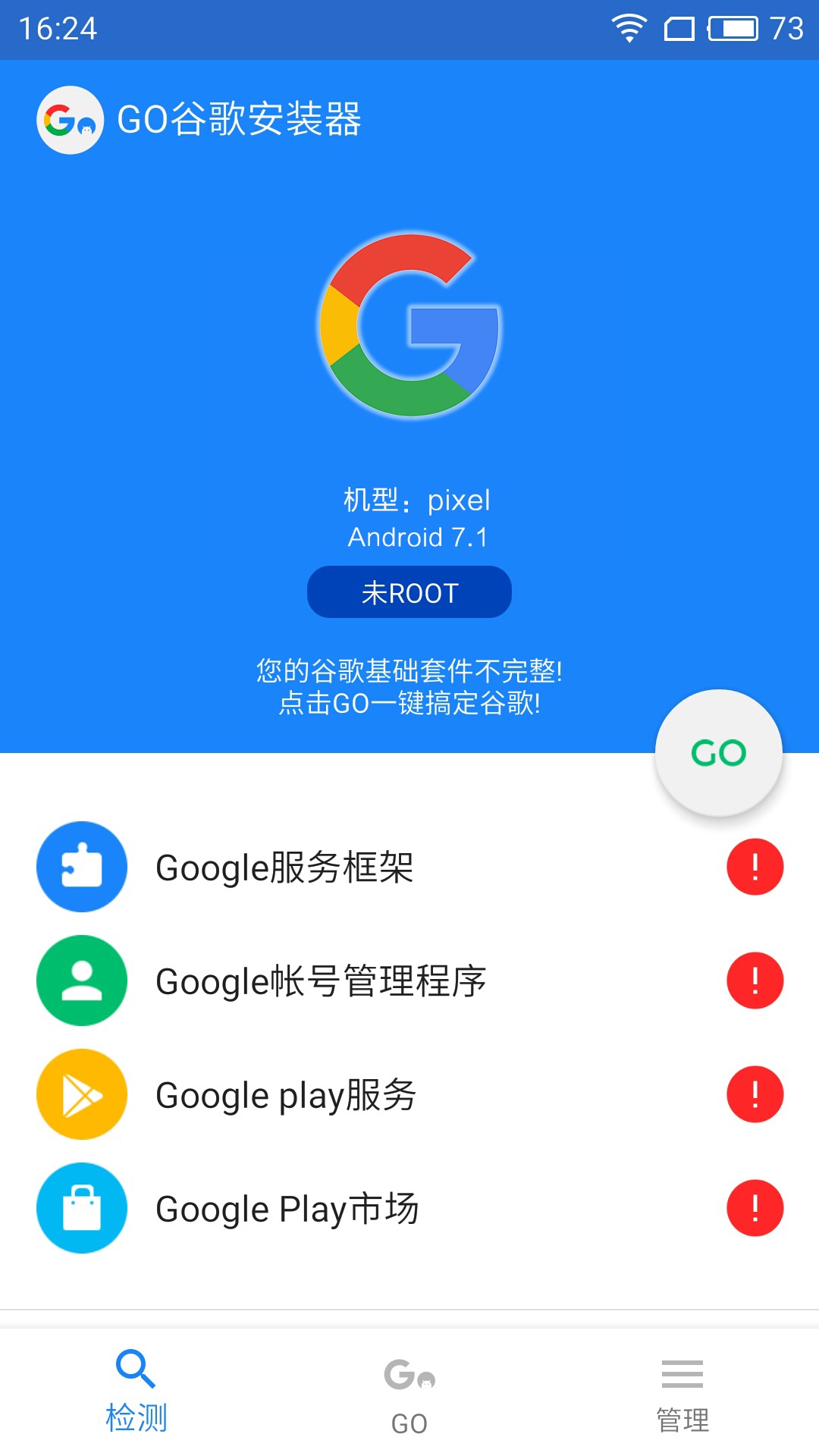 GO谷歌安装器(谷歌全家桶,谷歌三件套),方便好用的谷歌安装器,免root亦可尝试!适配小米、华为、魅族、一加等等品牌手机,帮你安装谷歌框架、谷歌服务、谷歌市场,玩游戏不再闪退。 因为ROOT安装之后更加稳定,建议已ROOT用户授权GO谷歌安装器ROOT安装谷歌套件。 GoPlay工作室出品,不断适配机型,如果发现谷歌服务无法使用记得上报噢!