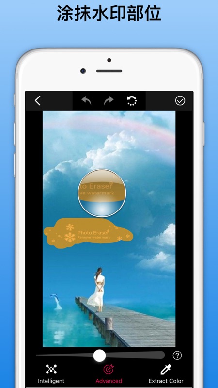 去水印,照片去水印。不仅仅是去水印,可以去除图片中一切不想要的东西。去掉文字,去掉杂物。。。只需要在想去掉的地方,手指涂抹即可消除。