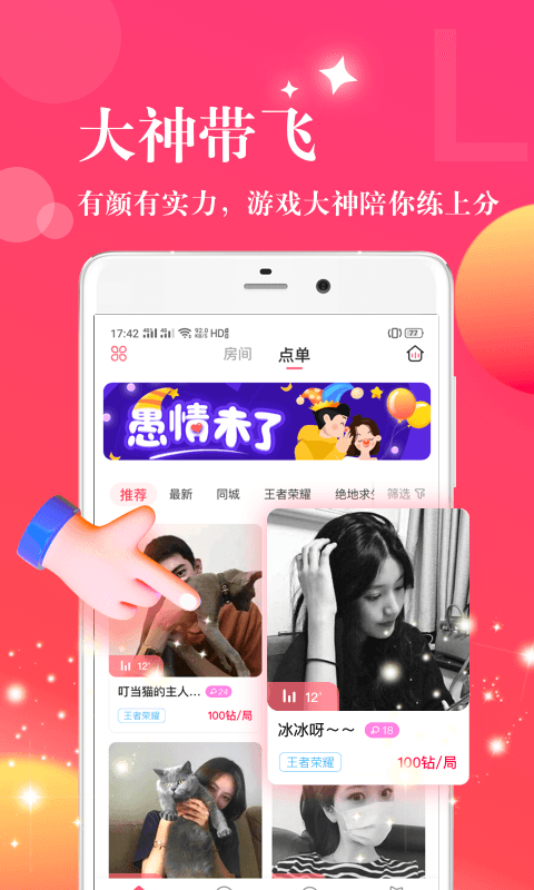 大神陪玩,匹配符合你游戏类型和风格才艺大神,随时互动指导游戏,和小哥哥小姐姐一起开黑玩游戏让你轻松上分。