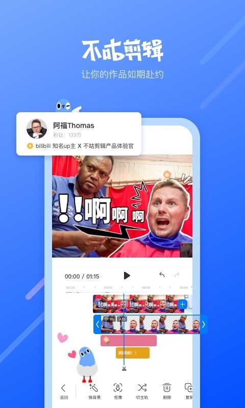 不咕剪辑,一般又称视频剪辑软件不咕剪辑app。【不咕剪辑】是一款UP主都在用的视频剪辑神器,上线至今共入选苹果商城精品推荐24次!领先的智能AI技术,让你不用绿幕就可以一键抠像,不仅可以一键抠出三次元人物,也可以抠出视频中的任意物体,还有海量音乐、转场、素材以及贴纸,大幅降低创作门槛的同时给视频加点创意,助你快乐玩转B站梗!一键发布B站,让你投稿快人一步!