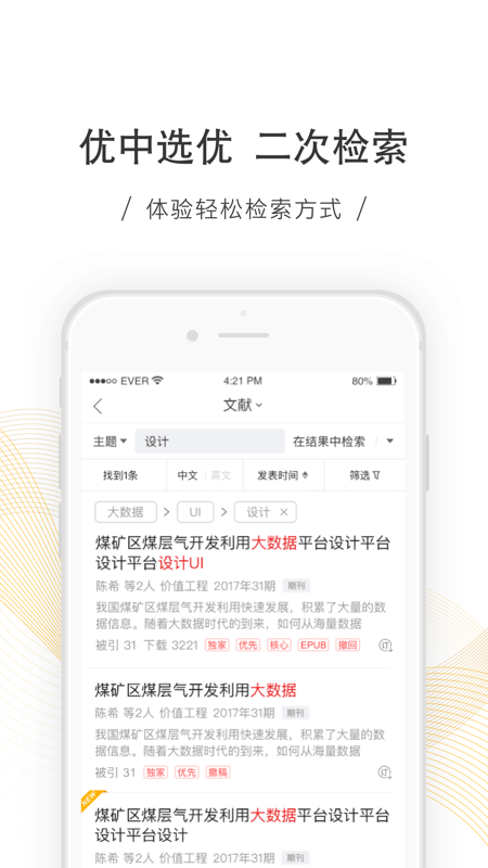 这款app的特点1.个性定制。结合大数据技术联系用户个人定制,用户可以在7大门类,4000多个主题中定制自己感兴趣的学科,系统会实时为用户推送定制的相关文献、期刊出版物和感兴趣的会议。