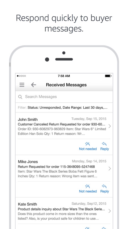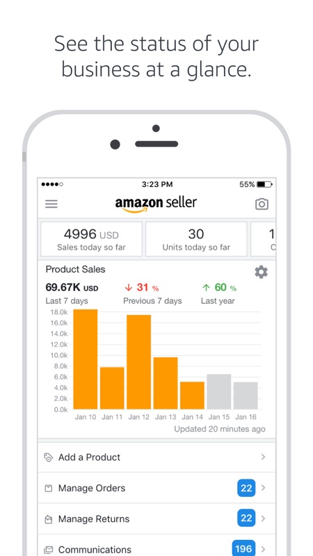 亚马逊卖家app来自全球电商平台亚马逊官方为广大中国的亚马逊商家们提供的亚马逊卖家平台手机版客户端,亚马逊卖家app随时随地通过亚马逊卖家app监控自家店铺的生意情况,亚马逊卖家app还可以及时通过亚马逊卖家app和你的国际买家在线实时沟通哦!