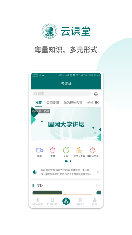 国网大学云课堂是一款专注于企业内部培训的在线培训工具。学习平台承载大量在线课程,名师直播互动、线上线下相结合的培训活动,旨在帮助学员快速获得全面的知识和技能,实现学以致用目标!