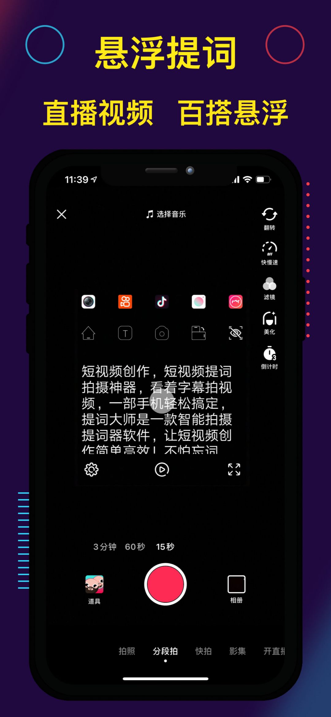 提词大师是一款智能拍摄台词提词器软件,一部手机同时拍摄加透视提词。完美解决多手机提词、购买高价提词器、忘记台词以及拍摄的短视频看上去眼神和镜头偏离的困扰;让眼神更自然,视频录制效率提升N倍