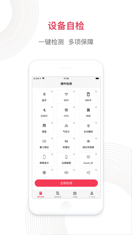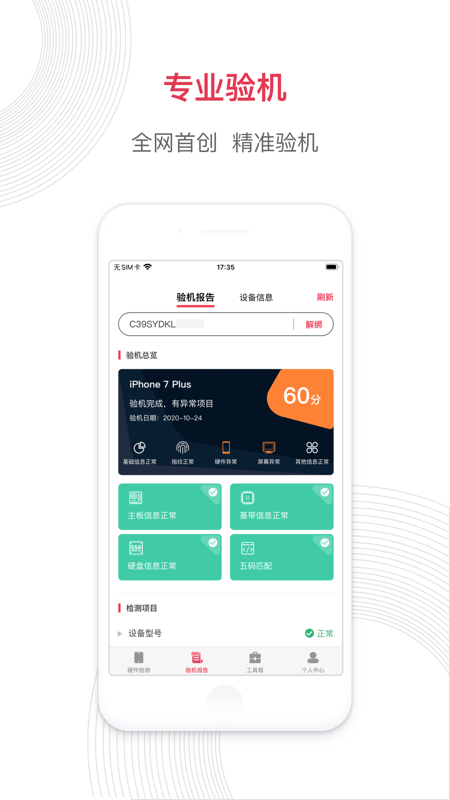 沙漏验机APP是沙漏验机助手推出的手机验机客户端,支持一键检测设备功能是否正常,并结合电脑验机报告进行展示。
