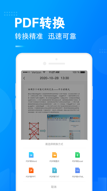 PDF是一款专业的多格式文档图片互转app,功能强大、专业简单,可以把不可编辑的PDF文档转换成Word/Excel/PPT/TXT等文档,满足不同用户群体的专业全能FPD扫描仪。