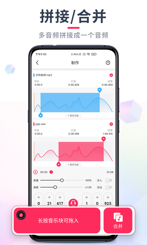 音频编辑大师是一款操作方便的MP3剪切合并器工具。支持对MP3文件进行任意时间段的切割,也可以把多段音频合并成一个文件。