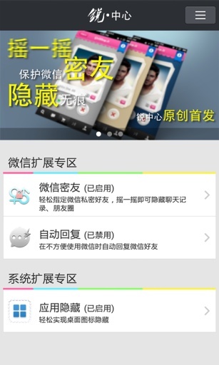【应用隐藏】锐中心还是一个系统实用工具,能够隐藏选定的手机应用,摇一摇显示隐藏应用图标。