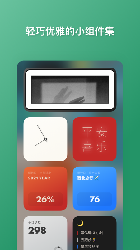这是一款轻巧、优雅又实用的小组件工具集,它不到 10M 大小,但却可以搭配出超过 300 种样式的小组件。当然了,数量多并没什么好骄傲的,更重要的是,每款小组件都是经过了精心设计而打造的,它们不仅实用,而且极易搭配,你可以轻松得到自己搭配的优雅小组件。
