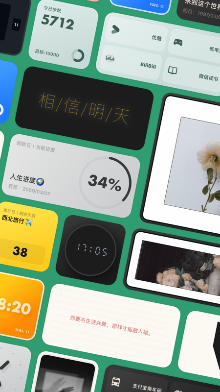 - 单语录:将一段文字输入展示在小组件上,可用于自勉、座右铭、简单的提醒事项等;你还可以对不同内容文字选择自己喜欢的风格样式。