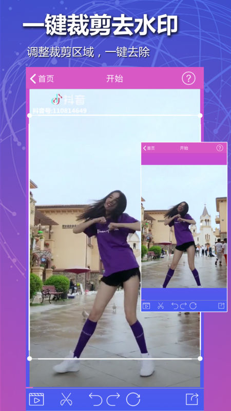 【裁剪去水印】:把有水印的区域裁剪掉,简单方便干净不留痕迹,点击剪刀切换裁剪模式;