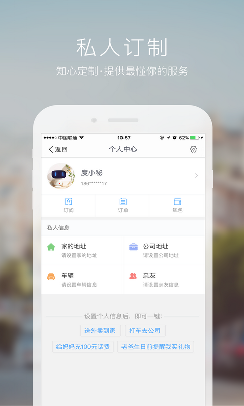 度秘能够提供适合个人口味的外卖,关键时刻提醒你为家人送上祝福。随时随地跟度秘交流,贴心的度秘,伴你每个精彩瞬间~
