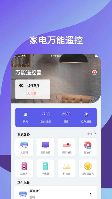 可以通用使用在家庭常用的空调,电视,机顶盒,音响,扫地机器人,净化器等各种智能红外家电设备上。