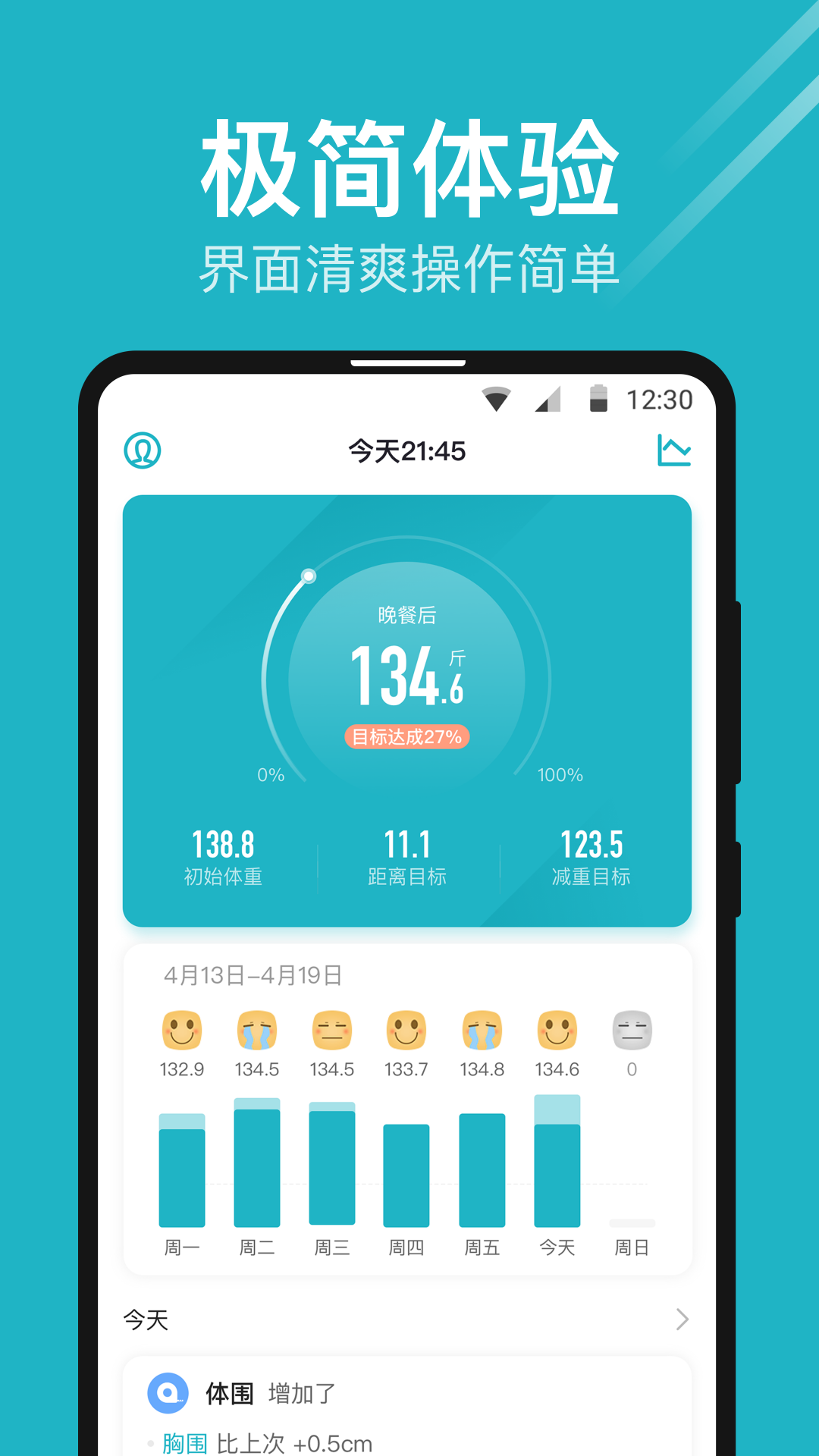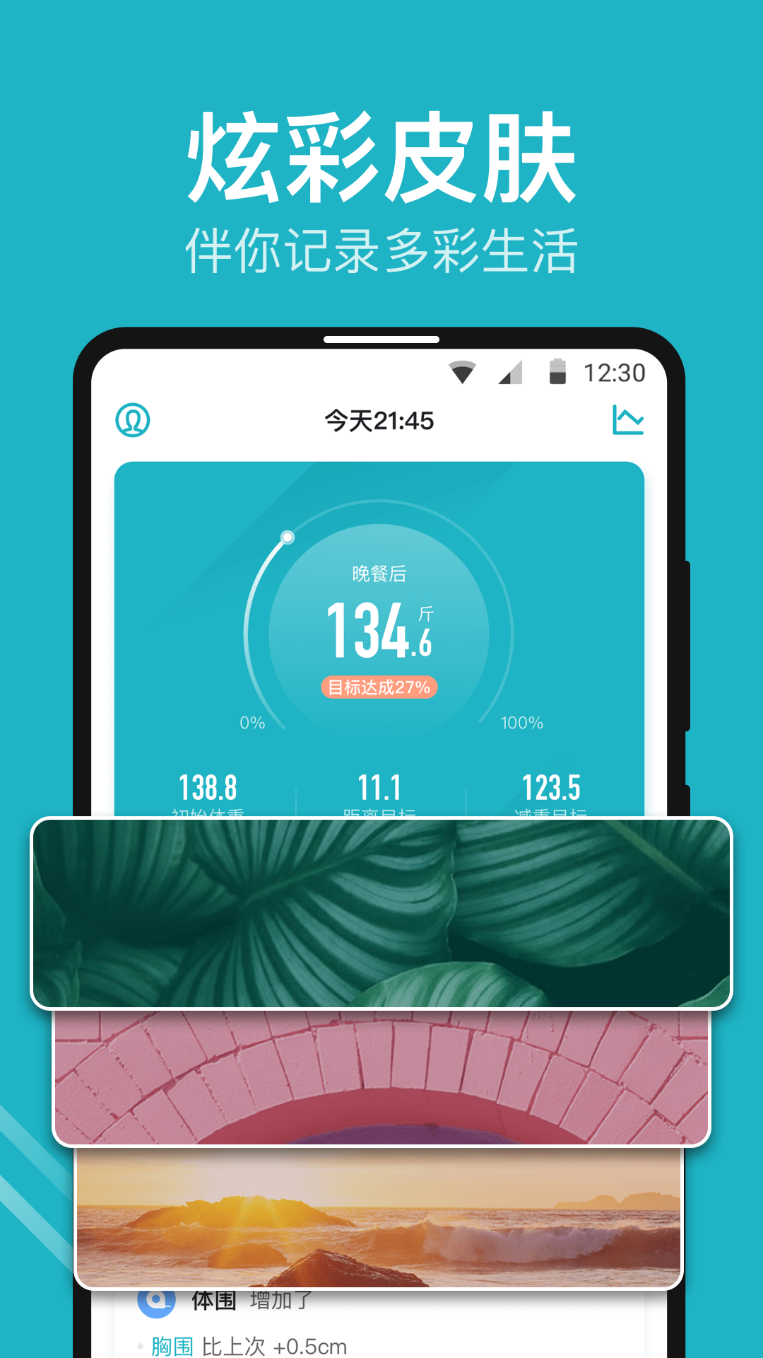 2、体重列表、柱形图、趋势线、百分比圆环等多种方式为您展示减肥进度,支持目标完成时间预测