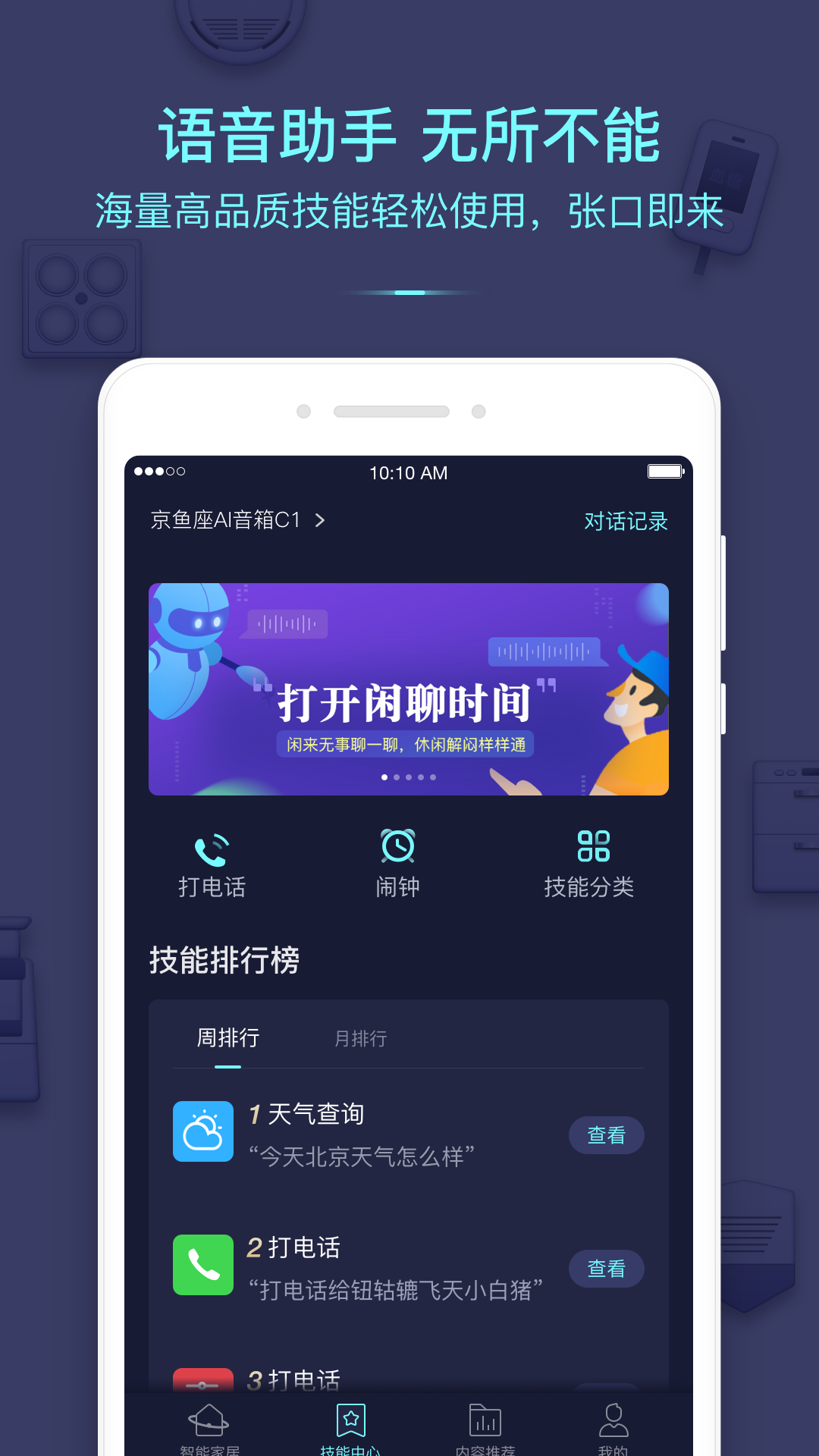 打电话、听音乐、设闹钟、查天气…“小京鱼”为您呈现海量高品质技能,贴心提供使用方法,助您轻松使用技能。