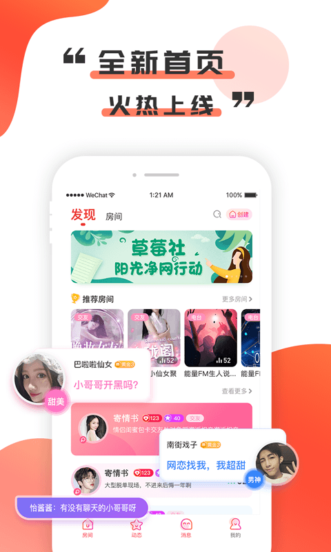 快速交友必备!我们有人美声甜的小姐姐,颜高声暖的小哥哥,一起玩游戏,pia戏,听歌……梦里寻TA千百度,蓦然回首,那人就在草莓社~一键进入,来一场超完美的邂逅吧!