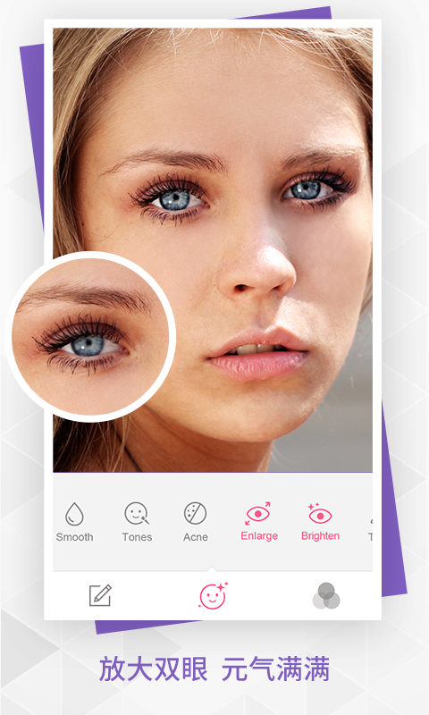 - 美化眼睛:优化眼部轮廓,提亮双眼,同时放大眼睛,迷人电眼立即呈现。