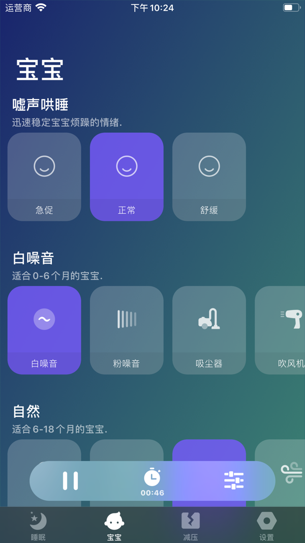 我们的育儿专家为各个年龄段的婴儿选择了一系列声音,可以有效地平息婴儿的情绪并促进婴儿快速入睡,包括了0-6个月宝宝、6-18个月宝宝、18个月以上的宝宝。我们有3种不同节奏的婴儿嘘声,也包括一些场景(适用于各个年龄段):