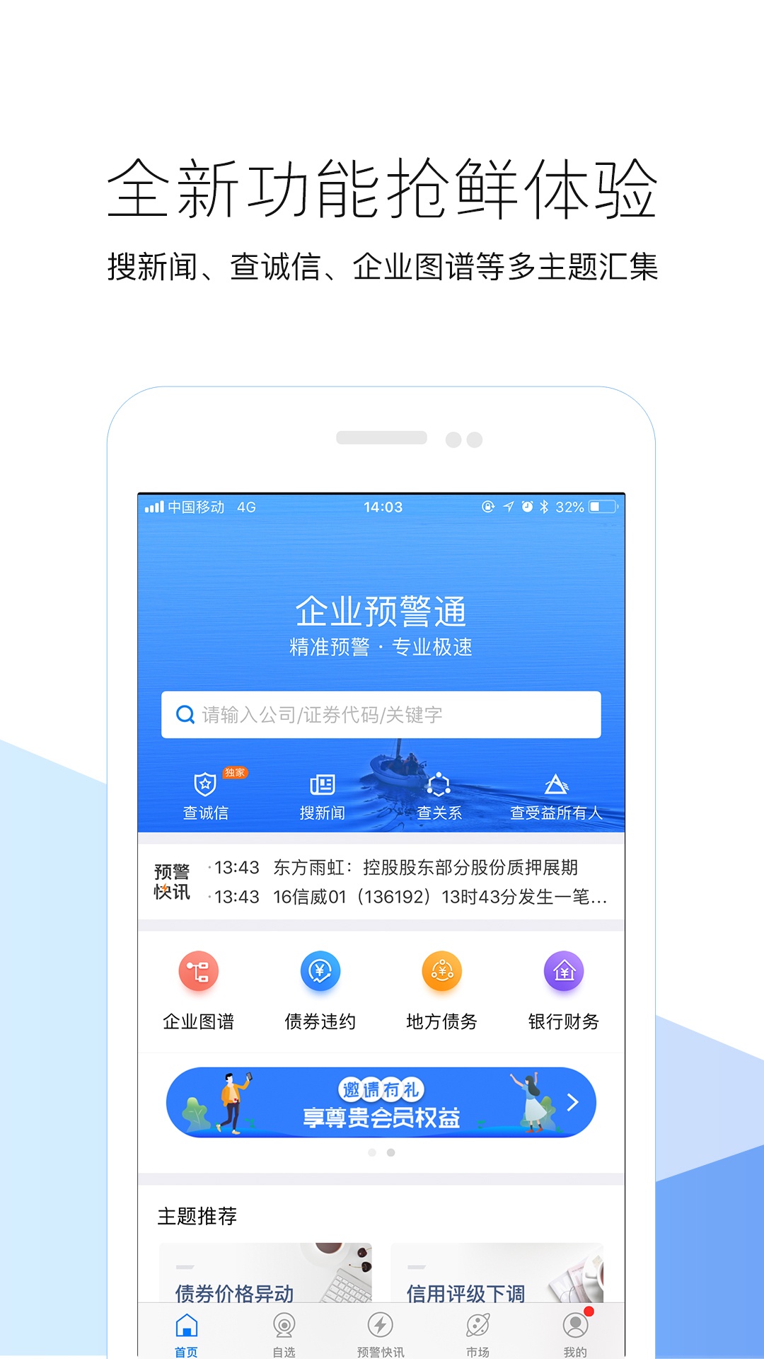 企业预警通是一款将人工智能运用于大数据领域的移动端企业风险监控产品,可实现千万企业的风险监控与推送提醒,加强企业风险预警,防微杜渐实现企业本身及其关联企业的风险全景化监控。
