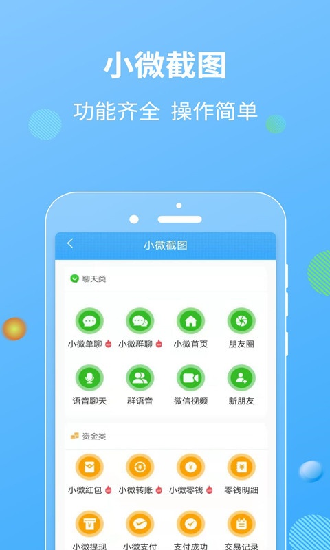 微商截图全能王是一款程序员日日夜夜开发的专业截图工具,效率不要说,大家一试就明白!微商截图王,微商刷圈器,做个截图,微商截图这些在微商截图全能王里应有尽有。转账、聊天、红包、账单、银行卡、零钱,这些功能齐全。