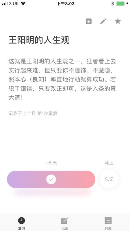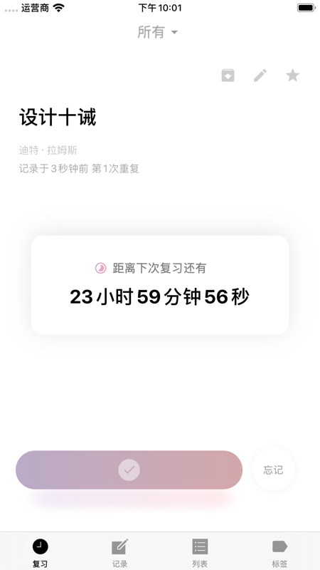 点评:记过的笔记就再也不会复习了?「Anki 备忘录」会智能帮你复习、回想笔记,让你记住所有不想忘记的笔记。「Anki 备忘录」是一个记忆辅助备忘录,根据遗忘曲线按顺序为你显示曾经记过的所有笔记,根据科学的记忆周期提醒你,无痛记忆。