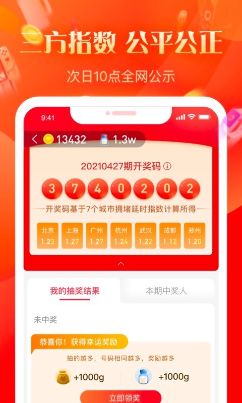 1.中奖号码,全随机:每日选取北京、上海、广州、杭州、武汉、成都、郑州7个城市早上8点的“高德拥堵延时指数”的第二位小数按顺序组合拼成中奖号码,全随机,无规律,才是真公平。
