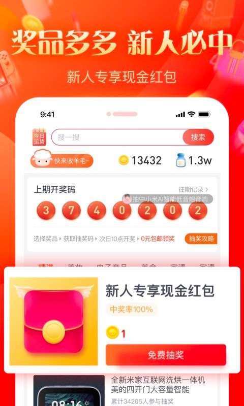 1.参与抽奖,免费:不搞一元夺宝、不氪金,使用抽奖额度参与抽奖,小到纸巾洗手液大到手机电视机,统统免费抽。