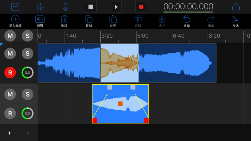 2.支持复制,粘贴,截取,增益,分割,合并,移动,吸附,淡入、淡出、交叉淡入淡出效果。