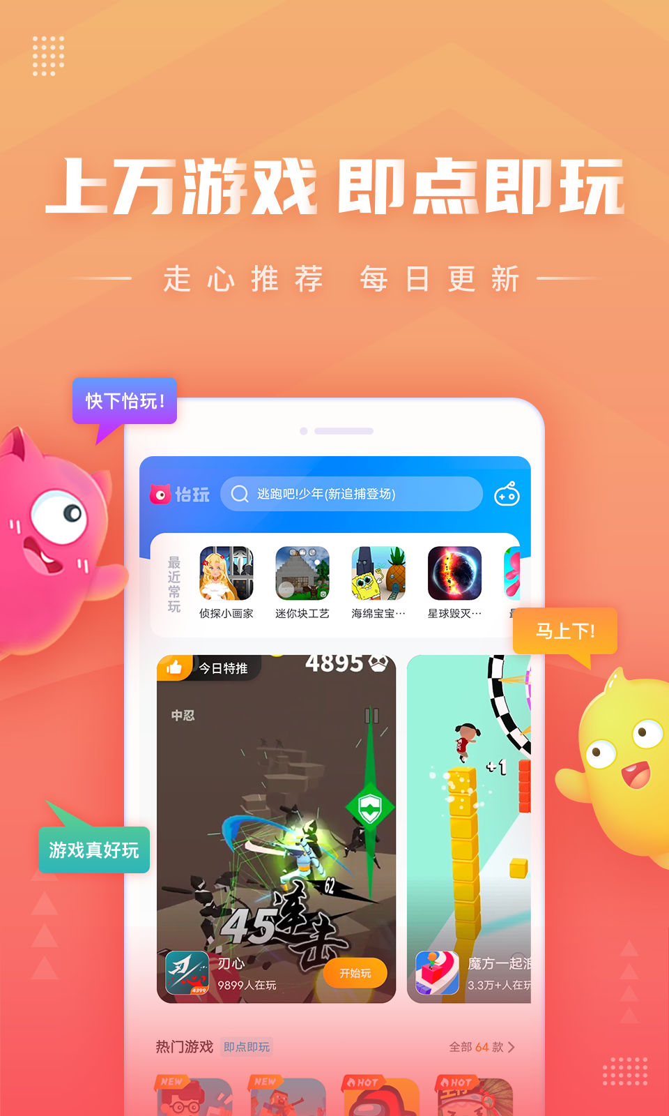 《怡玩》是一款网罗了时下各类新潮热门游戏的应用,超魔性好玩的小游戏、经典有趣、欢乐挑战的沙雕游戏应有尽有。用《怡玩》玩游戏免安装,更省事,手游也能即点即玩。快来体验吧!