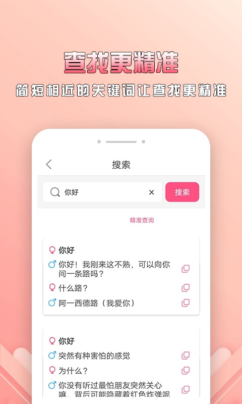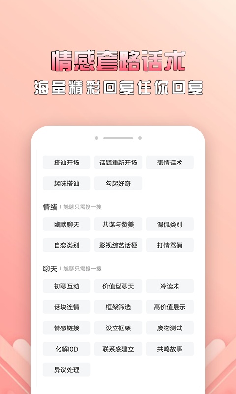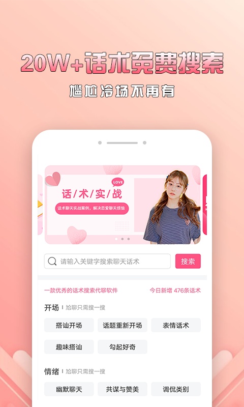 聊天话术app是一款非常专业的恋爱话术软件,这里有上百万条恋爱话术,让你轻松读懂女生话中的隐藏含义,还能查看恋爱实战经验,在线学习话术的运用情况,帮你撩女神,哄女朋友,赶快下载体验吧!