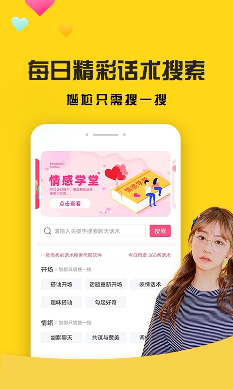 聊天神器是一款聊天开挂神器,主要社交软件使用,特别适合不善于撩妹聊天的男生和善于撩妹的女生,“快”是聊天神器的核心所在,输入对方信息的关键词5秒内能匹配出精准的回答语录,找人闲聊30秒内有人回复,大神根据用户的聊天截图1分钟内完成回答,下载体验看看吧。