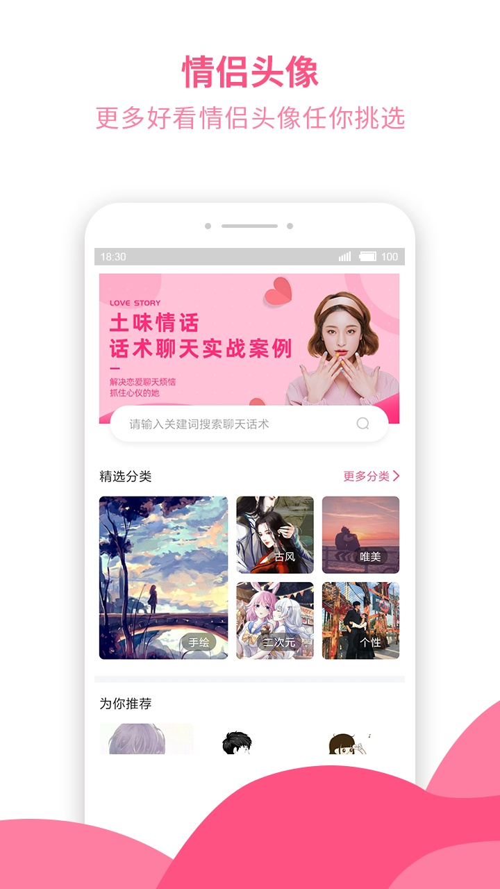 想和心中的他/她联系在一起吗?那就快和他/她一起使用情侣头像吧!情侣头像App—全网精选海量热门情侣头像大全, 适配支持QQ头像、微信头像以及贴吧、微博等上百款app,找到你和他/她的专属情侣头像吧。