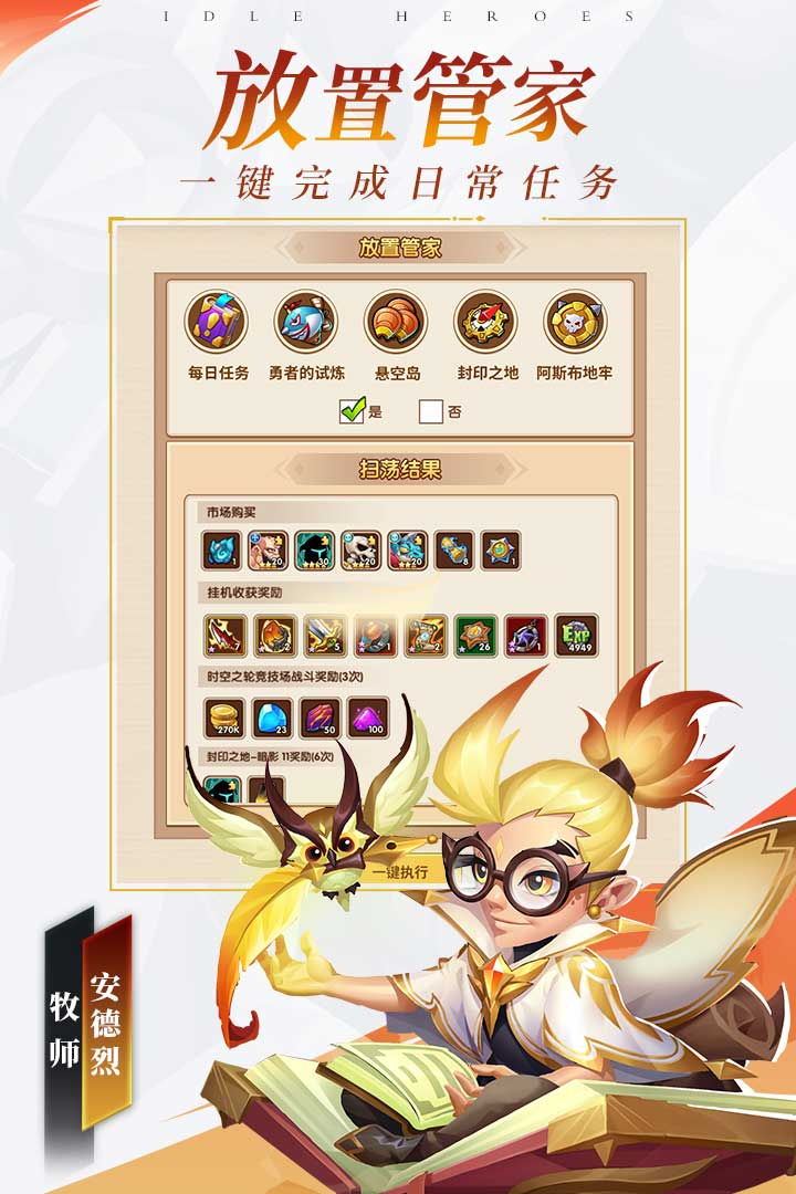 新服一百五十连,四重好礼,资源爆仓! 回归直送新英雄,活动超多,福利爆棚! 新英雄新皮肤等您翻牌,放置极限翻盘! 【游戏福利】 英雄本体直接送,等级共享不用养! 资源掉落满背包,零碎时间领福利! 百变玩法周更新,躺赢虎年超有趣!