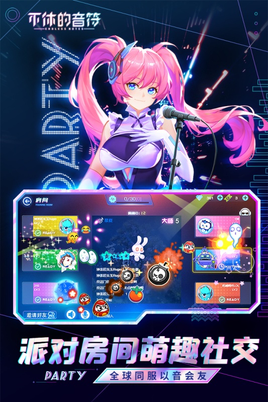 《不休的音符》是一款赛博朋克风格的落键式音乐手游,力求打造更年轻、更潮流的音游体验。玩家可以通过四键操作闯关打歌,解锁聆听海量潮流歌曲。游戏在传统下落式按键玩法的基础上,增加了丰富的演奏皮肤,海量专辑收集,开创全新的大师赛玩法,与全国玩家角逐排名!同时游戏还设有派对房间玩法,可以自由匹配竞技PK。最后,游戏不定期更新正版授权乐曲和丰厚的奖励活动,让你时刻保持在潮流前线!