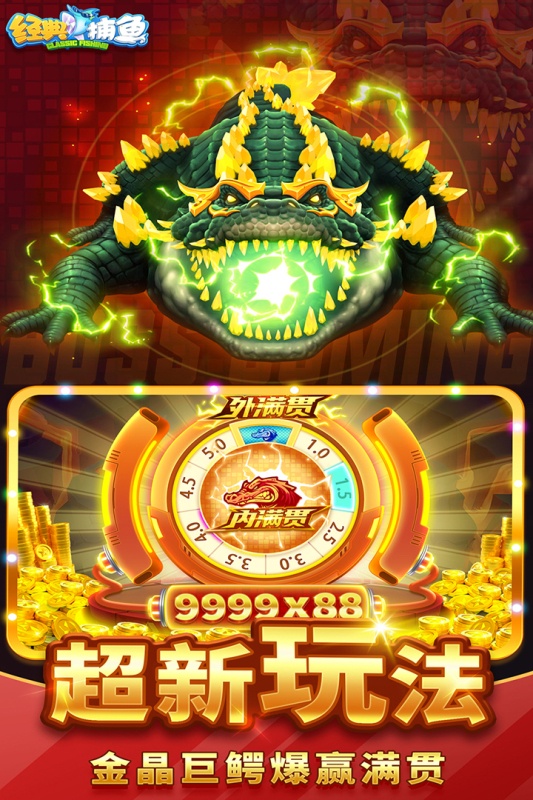 【全新玩法 海量boss】 1.海域专属boss:巨爪章鱼、火焰金刚、冰龙王、机械鲨鱼秒杀全屏! 2.众神战场boss:雷霆巨鳄、火焰神龙、金晶巨鳄、白金神龙暴赢20万倍! 3.冰霜鱼、爆炎蟹、激光鱼、鱼全屏轰炸,一发入魂。 4.章鱼扭蛋、召唤神龙、龙宫宝藏神秘宝箱,玩法多样惊喜不断! 5.美人鱼、岩浆魔龙、机械巨蟹随机倍率,亿万大奖花落谁家?