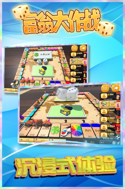 这是一款线上多人联机考验智慧和运气的大富翁游戏,适合2-6个玩家的桌游。你可以在游戏中交易土地、建造房屋、拍卖资产,以及体验到惊险刺激大转盘。在棋盘里叱咤风云,垄断土地并且让其他玩家破产是胜利的唯一条件。 -经典的大富翁玩法,简单的游戏规则,运气与策略并存才是你的获胜之道。 -多样化的游戏内容,合理运用规则成为 Real大富翁! -自定义游戏模式,随心开启或者关闭某些功能。 -多种游戏模式,你可以