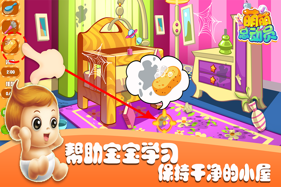《萌萌总动员》全面更新啦!最新玩法等你来探索! 宝宝真的很淘气,他们喜欢探索新鲜的事物,于是总是把公主的城堡搞得一团糟,现在就由你来扮演妈妈来和萌萌的宝宝一起帮助公主整理房间吧,让我们的城堡再次闪耀!操作对应的工具以去除灰尘、污渍和蜘蛛网,并将每个物品摆放到正确的位置。如果遇到困难不知道如何下手,可以点击提示按钮获取帮助哦!